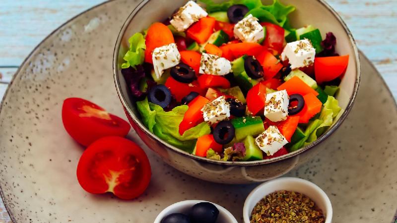 Kahı, xiyar, pomidor, pendir, bitki yağı, qara zeytun, limon şirəsi, reyhan